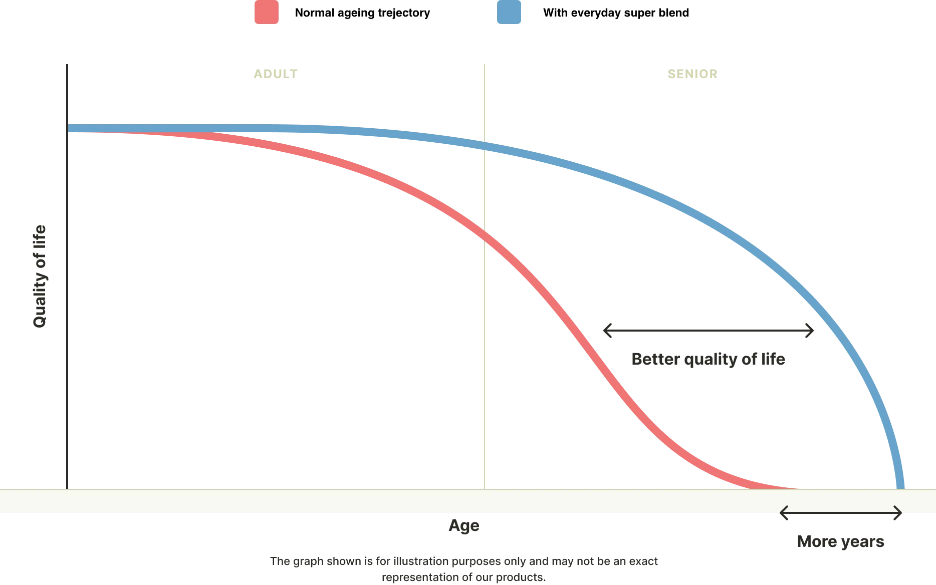Energy levels, joint health, skin and coat, gut health, and even heart and kidney function. It’s for the things you notice when your pup starts slowing down.